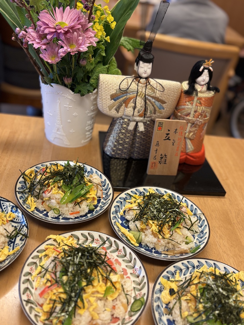 ひな祭り当日は散らし寿司を作り、おやつには道明寺とひなあられ(風)を。