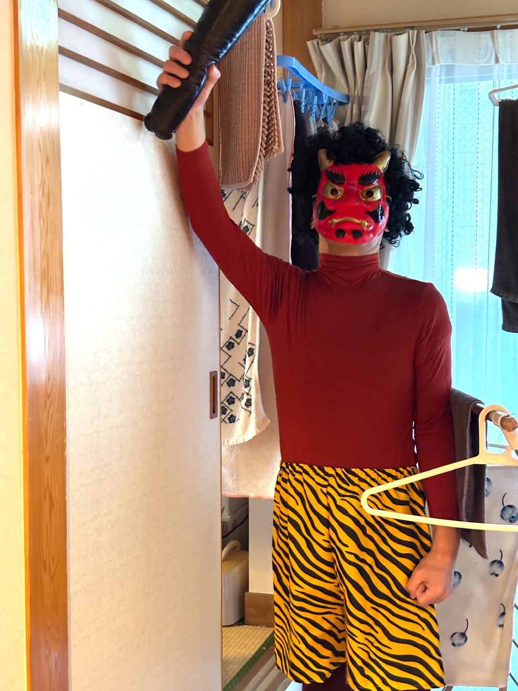 スタッフの合図で鬼が中へ。皆さん「わー!鬼は外―!」と言いながらも笑顔で撃退してます笑。