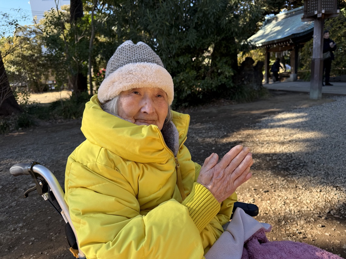 初詣では「たくさん人がいるのね!」と驚かれながらも、しっかりと手を合わせてご家族やご自身の健康と幸せを願っておられました。