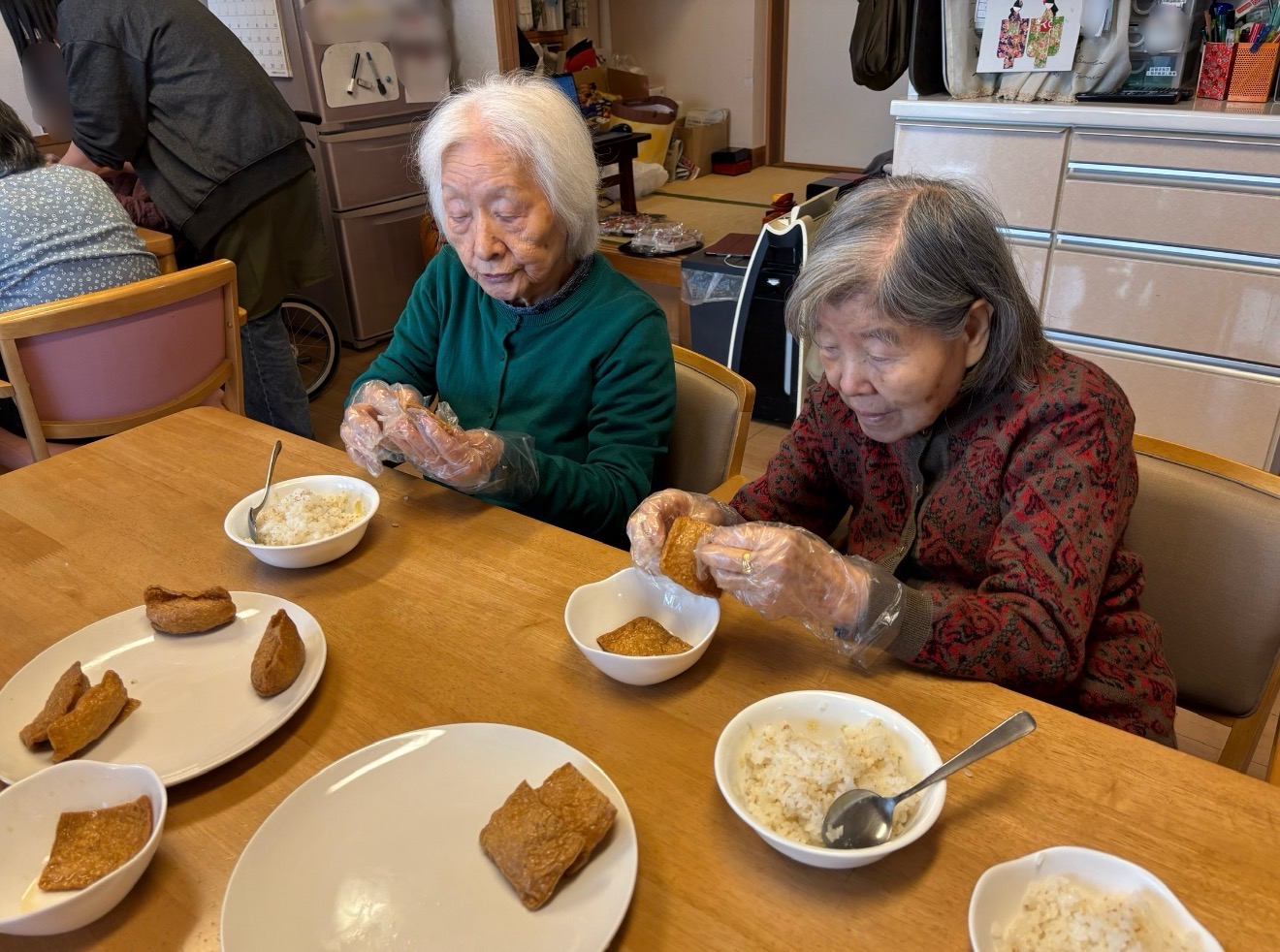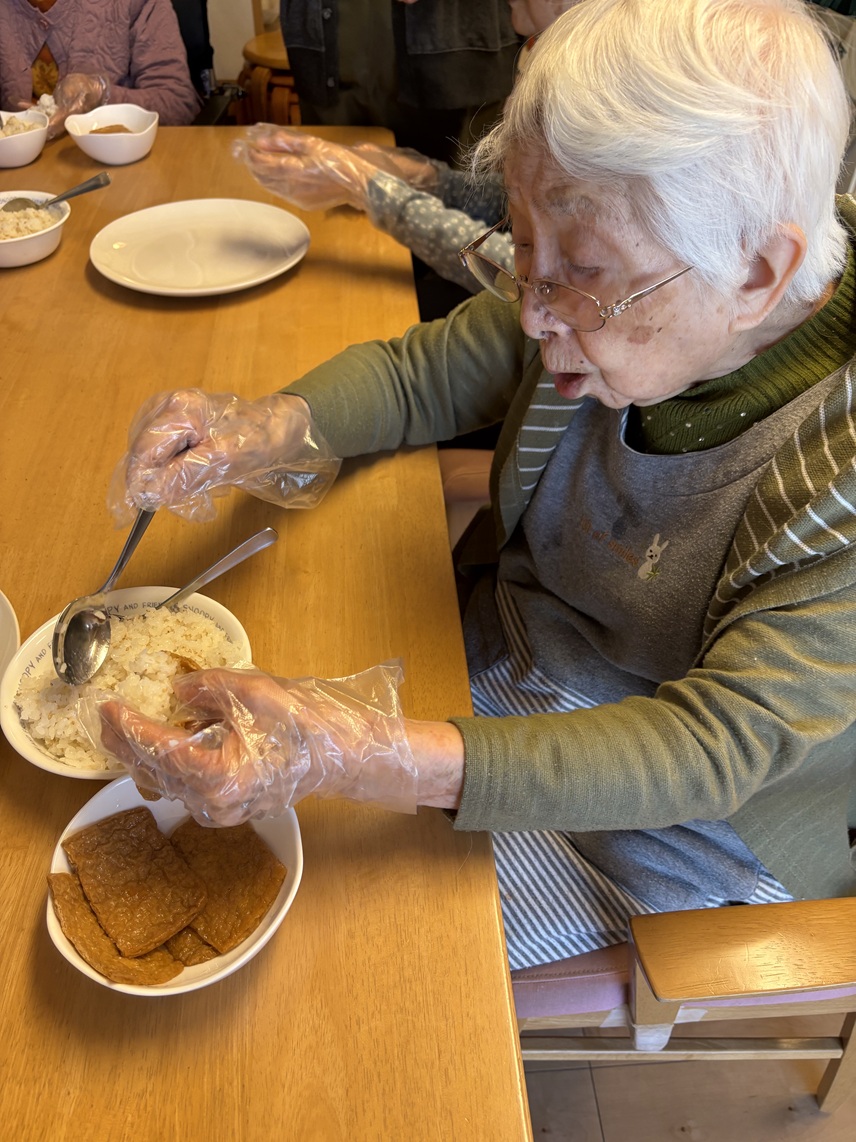 ホーム恒例のお稲荷さん作りや、前日までに作っておいた紅白なますや数の子などを盛り付けます。