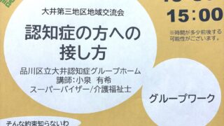 イベント認知症の方への接し方講座 皆さんこんにちは。グループホーム大井の小泉です。今回は1月15日に大井第三地域センターで行われた「認知症の方への接し方」の講座についてのご報告です。昨年秋ごろに第三地域センター「支え愛・ほっとステーション」のご担当者の方より、「地域の方に向... 2026.01.19イベントセミナー研修
